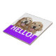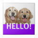 Say Hello! This ceramic tile features a photograph of two smiling golden retriever dogs, with the word HELLO! in purple.