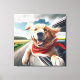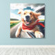 A joyful Golden Retriever with a red bandana around its neck leans out of a car window, enjoying the wind