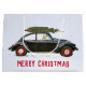 Golden retriever dog driving a retro black car in snowflakes with green Christmas pine tree on roof.