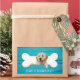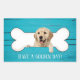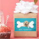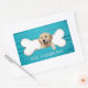 Cute golden retriever in dog bone graphic on rustic aqua colored wood background