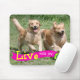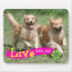 This mousepad features a photograph of two golden retriever dogs running happily through a green field. Caption reads, "Live With Joy!"