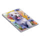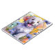 A digital art image of a joyful golden retriever puppy with a pink tongue sticks out, surrounded by vibrant blue flowers and colorful splashes of paint. The dog's expression radiates happiness and playfulness amidst the lively, artistic background.