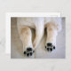 Looking down on back end of tiny Golden Retriever puppy, with cute fluffy tail and black paw pads.