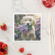A fluffy golden retriever puppy holds a cluster of lilac flowers in its mouth, surrounded by a lush garden filled with blooming lilacs