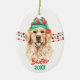 A beautiful Golden Retriever dog wears a red and green Santa Claus hat in front of strings of red and green Christmas beads on both sides of this ornament. At the bottom are two text fields in matching red and green for your own text. The back has the same image with a third text field in red. Perfect for anyone who is owned by a Golden!