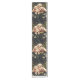 A close-up of a black and white table runner with a printed design of four golden retriever puppies sleeping in the grass. The runner is draped over a wooden table.