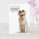 Golden retriever wearing a funny face mask on white background for getting older birthday humor.