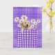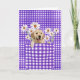Cute blond golden retriever dog in purple and white gingham pocket with daisies for general birthday.