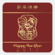 Chinese New Year of The Rooster square sticker with Greeting in Chinese and English on dark red customizable background. Year is customizable too. Matching Greeting card, postcard.