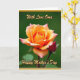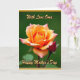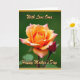 This design shows a fully opened rose filling the center, its petals curling in a soft spiral from a warm golden-orange core to peach edges brushed with light pink. Nearby, a small crimson rosebud leans in close like a quiet companion, adding a gentle note of romance ❤️. The flowers sit against a deep green background that fades into a soft blur, making the petals look velvety and touchable. Light falls across the blooms in a way that suggests a tender, shared moment, as if the larger rose is sheltering the bud. A shiny golden frame runs around the border, giving the scene a dressed-up, celebratory look. Near the top, stylized gold lettering with a thin outline carries the message, and smaller matching text sits lower in the layout for balance 🌼. The main rose shows a glowing orange center with peach-and-pink outer petals, while the rosebud stays a rich ruby red beside it within the gold border.