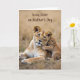 This card shows an adult female big cat resting on sandy, earth-toned ground while her small tawny cub cuddles close, pressing a tiny paw to her shoulder in a gentle, affectionate gesture ❤️. Their golden fur looks soft and sunlit, and the mother’s amber eyes meet the viewer with a calm, protective gaze that suggests a close family bond. Behind them, a straw-colored grassland stretches out in a hazy, warm glow, giving the scene a quiet, late-afternoon feel. The pair sits low in the composition, leaving open space above that keeps attention on their closeness and the tender touch between them. Across the upper portion, the message “to my Sister on Mother’s Day” appears in flowing cursive lettering, set in a dark tone that stands out against the pale sky. The lighting is diffused and gentle, adding subtle highlights along their faces, ears, and shoulders and soft shadows under their bodies. Small details in the fur and the relaxed posture make the moment feel intimate, like a shared pause between loved ones 🌼. The background remains softly blurred with dry grasses and muted beige tones framing the animals near the bottom edge.