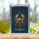 Stylish artistic representation of the Scorpio zodiac sign featuring a gold scorpion and a vibrant purple gem encircled by stars, set against a deep, starry blue background.