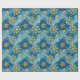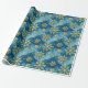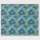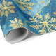 A field of golden snowflakes floats over a rich blue abstract background on this enchanting winter wrapping paper