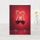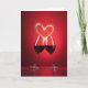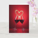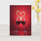 This card features two tall stemmed glasses filled with deep ruby-red liquid, angled toward each other as if sharing a close toast ❤️. Their rims nearly meet at the center, and the gentle tilt suggests a tender, shared moment between friends or partners. Above them, a glowing heart rises upward, formed from many tiny golden sparkles that look like drifting light. The background is a rich red gradient that shifts from lighter crimson near the middle to darker red around the edges, adding a cozy, intimate setting. Soft lighting creates glossy highlights along the glass curves and faint reflections on the surface below, like a quiet table at a celebration. Near the top, the main greeting text sits centered in a light gold tone, with smaller supporting words placed beneath it in a softer pale shade 🌼. The base area remains darker and slightly reflective, with scattered golden flecks around the stems and a subtle glow under the glasses.