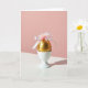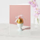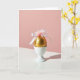This greeting card features a single metallic gold sphere resting in a smooth white ceramic holder against a warm blush-pink background 🌷. A shiny white ribbon is tied at the top in a neat bow, like a small gift meant for someone you adore. From the center, a soft tuft of airy feathers rises upward, with faint pink tips that echo the backdrop and add a tender, affectionate touch 🐇. Crisp directional light creates a long, sharp shadow that stretches across the white surface in front and climbs into the pink area behind, giving the scene a modern, romantic edge. The gold surface reflects highlights in a way that feels like a quiet wink, while the ribbon’s satin sheen and the feathers’ softness suggest closeness and gentle care. The main greeting text sits near the upper left in small white lettering, with a second shorter line placed beneath it in pale gold. In the foreground, a glossy white plane reflects a faint glow from the gold sphere and the bow, with the shadow slicing diagonally across it.