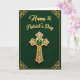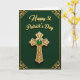 Designed with a rich St. Patrick’s Day look, the card centers on a golden Celtic cross filled with detailed knotwork that feels like a treasured keepsake shared between close friends 💚. Soft lighting falls across the gold, giving the raised details gentle shadows and a warm shine. In the middle of the cross, an emerald-green jewel glows like a small promise, drawing your eye in with a deep, glassy sparkle ☘️. The background is a deep emerald field that makes the gold stand out and adds a quiet, candlelit mood. Near the top, the words “Happy St. Patrick’s Day” sit above the cross in gold lettering with a slight 3D lift and a faint shadow. A double gold frame outlines the card, and each corner holds a curled ornamental flourish that echoes the cross’s looping patterns. The overall scene stays focused on dark green and burnished gold, with the cross anchored in the center and the border evenly spaced around the edges for a balanced look.