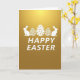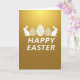 Designed with a tall layout, the card fades from a pale, glowing gold at the top into a deeper honey-gold near the bottom, like early spring light. Near the upper middle, crisp white silhouettes show two long-eared rabbits facing inward 🐇, their mirrored poses giving the scene a gentle, companionable closeness. Between them sits a row of three decorated egg shapes, arranged neatly so the rabbits seem to be admiring them together. The center egg is sprinkled with small star shapes, while the eggs on either side use stripes and dotted patterns for a soft mix of texture. Beneath this little tableau, a short greeting appears in large white sans‑serif letters, centered and set low to anchor the design. The strong white-on-gold contrast keeps the shapes and message easy to read while still feeling warm, like a shared note between friends 🌷. The star-speckled egg sits in the middle, flanked by a striped egg on one side and a dotted egg on the other.