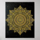 This is an original, highly detailed piece of art featuring a symmetrical, intricate Mandala design rendered in striking gold (or yellow-gold) on a deep black background. The design evokes the appearance of a blossoming flower or a starburst, radiating outward with layered patterns, fine lines, and traditional motifs. The black background is textured, suggesting a cosmic or starry night sky, which makes the luminous gold design stand out dramatically. This artwork is perfect for adding a touch of spiritual elegance, meditative focus, or Bohemian luxury to any space.