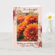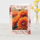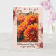 On the front of the card a rectangular inset features dahlia-like blooms in rich orange tones, their layered petals fanning outward around a green-and-yellow center that feels like a warm, affectionate gaze. A thin golden border frames this floral panel, giving it a gentle glow that pairs nicely with the romantic mood ❤️. Around it, a blush-pink background shows larger, softly blurred flower shapes in muted rose shades, like a calm backdrop to a close friendship. Near the top, the phrase “To a beautiful Step Mom” is placed above the inset in flowing brown lettering, with “Step Mom” picked out in gold to echo the frame. Beneath the inset, the line “Wishing you all things lovely on your special day” appears in the same brown lettering, centered and easy to read. The contrast between the crisp orange flowers and the hazy pink florals creates a tender, intimate feel, like a quiet moment shared between two people 🌼. The orange blooms sit sharply within the golden frame against the soft blush field, with faint rose-toned petals drifting in the background.