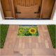 Welcome doormat that can be customized featuring a large sunflower backlit by the golden sunlight in a field in Willard Missouri, United States during golden hour sunset. If you look close you can see a bumble bee on the flower.