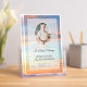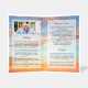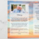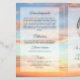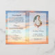 Funeral program with four sides personalized with an oval photo on the cover and another photo inside against a background of a golden sunset against a blue sky with beautiful clouds. Add obituary, order of service, a bible verse or poem, acknowledgements and more. Folded funeral program personalized with photos and custom text with a cloudy sky at sunset in warm colors and blue.