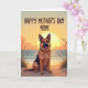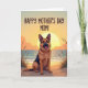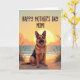 Designed with a serene coastal scene, the card centers on a large dog with rich brown-and-black fur sitting alert on pale sand, gazing forward with a friendly, open-mouthed look that feels like a devoted companion’s welcome ❤️. Behind the dog, a low sun rests on the horizon, washing the sky in layered gold and soft orange that reads like a gentle embrace. Tall, wheat-colored beach grass rises on both sides, leaning slightly as if a light breeze is passing through. The ocean stretches across the middle distance in calm blue and turquoise bands, adding a quiet, steady backdrop to the dog’s attentive pose. Near the top, the greeting “HAPPY MOTHER’S DAY MOM!” is placed in uppercase lettering, standing out clearly against the warm sky 🌼. The text appears centered and evenly spaced, with a bright tone that contrasts with the sunset gradients without overpowering them. Soft, diffused light smooths the scene, tracing the dog’s face and the dune edges while keeping the background gentle. Golden grass frames the lower corners, and the sun’s round edge glows just above the waterline.