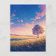 This ethereal postcard captures the breathtaking transition of a golden sunset into a star-studded night. A magnificent, solitary tree stands as the focal point, its leaves illuminated by the warm, amber glow of the fading sun. Below, a vibrant meadow of blue and purple wildflowers blankets the rolling golden hills. The sky above is a masterpiece of color, blending soft peach and pink clouds with a deep azure blue that reveals the first shimmering stars of the Milky Way. This postcard is perfect for sending a note of peace, a heartfelt thank you, or a wish of wonder to someone special.