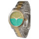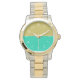Watches are both functional and fashionable. Golden Sunset Waters features classic white numbers over a dual-color face of aqua and gold. Classic elegance has never been more evident.