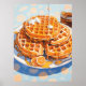 A mouthwatering digital artwork featuring a stack of golden, crispy waffles drenched in rich, flowing syrup and topped with creamy butter. The warm tones of the waffles contrast beautifully with the soft blue floral background, adding a cozy yet elegant touch. A slice of fresh orange enhances the composition, making this piece a perfect celebration of breakfast indulgence and food artistry.