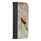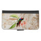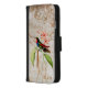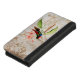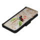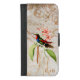 Wallet case with a brightly colored green, blue and red hummingbird perches on a pink orchid, on an off-white vintage grunge background with gold swirls and floral silhouettes.