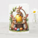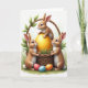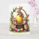 This card shows a spring scene centered on a rustic woven basket, set in fresh green grass with a gentle morning glow 🌷. Three fluffy bunny-like animals with caramel fur and bright white accents gather close, giving the moment a friendly, together-at-the-same-secret kind of closeness 🐰. Two stand on either side with their front paws resting on the basket rim, leaning in as if sharing a quiet discovery with one another. Their warm brown eyes are trained on a large golden egg nestled inside, its smooth surface catching soft highlights and faint reflections. A third little hare balances on top of the golden egg with upright ears, adding a lively vertical touch to the scene. Curving green leaves and foliage wrap around the basket handle, framing the group like a natural arch. The Easter greeting appears near the top in a light, soft-toned color, with a smaller line of text placed beneath it in a darker shade for contrast. In the foreground, three small decorated eggs in red, blue, and orange sit among the blades of grass below the basket.