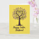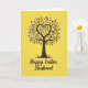 Designed with a sunny golden-yellow background that deepens slightly toward the edges, this card feels like a bright spring afternoon 🌷. In the center, a dark purple tree trunk rises from a small tuft of grass, and its curling branches loop together to form a large heart shape. The heart outline creates a tender, close-knit mood, like two friends leaning in for a quiet moment or a couple sharing a knowing glance. Leaves in deep violet and soft lavender fill the branches, layering the heart with gentle color contrast against the warm backdrop. Scattered among the leaves are small round dots with a light golden shine, like tiny keepsakes tucked into the canopy. Below the tree, a flowing greeting appears in deep purple, centered near the bottom so it reads clearly without crowding the artwork 🐇. The grass at the base is drawn as a simple cluster of slender blades in a slightly darker yellow-green.