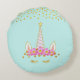 Golden Unicorn, Flowers & Gold Confetti on Teal Round Pillow