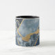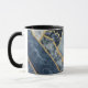 The image is a visually captivating abstract artwork that combines geometric shapes and organic wave patterns. The design features a harmonious blend of triangles, rectangles, and irregular shapes, all outlined with thin golden lines. The color palette is dominated by various shades of blue, ranging from deep navy to light sky blue, complemented by patches of textured gold. The interplay between the cool blues and the warm gold creates a striking contrast that adds depth and richness to the composition.