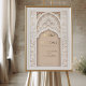 Usher your guests into your Nikah ceremony with this majestic welcome sign, adorned with the elegance of Islamic architecture. It features a golden arch that beautifully frames the welcoming script, while intricate arabesque patterns cascade down the sides, complemented by chevron columns. The design's color palette of gold, cream, and ivory sets a luxurious tone, as the card reflects the light, creating a shimmering effect that captures the essence of your special day. Perfect for greeting guests at the venue entrance, this sign is not only a guide but a piece of art that enhances the celebratory atmosphere.