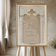 Usher your guests into your Nikah ceremony with this majestic welcome sign, adorned with the elegance of Islamic architecture. It features a golden arch that beautifully frames the welcoming script, while intricate arabesque patterns cascade down the sides, complemented by chevron columns. The design's color palette of gold, cream, and ivory sets a luxurious tone, as the card reflects the light, creating a shimmering effect that captures the essence of your special day. Perfect for greeting guests at the venue entrance, this sign is not only a guide but a piece of art that enhances the celebratory atmosphere.