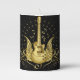 Fantasy style golden guitar with wings surrounded by scrolling details and musical notes.