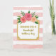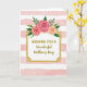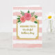 Designed with a soft, romantic touch, this greeting card features a white rectangular panel centered on the front, edged by a shiny gold border with delicate flourishes in each corner. Above the frame sits a trio of full roses, shaded from deep fuchsia to warm peach, with green leaves that lean toward each other like they’re gently sharing space ❤️. Behind everything, horizontal bands of pale pink watercolor alternate with crisp white stripes, and the brushy texture adds a cozy, close-to-the-heart feel. The main text sits inside the white panel, centered and written in gold, with “WONDERFUL” in clear capital letters and “Mother’s Day” in a flowing cursive style. The gold lettering catches the eye against the white, while the roses draw attention upward like a tender crown 🌼. Small golden accents peek through the greenery, tying the floral cluster to the frame. The background shows soft pink wash bands alternating with white stripes across the entire card.