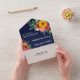 Charming floral all in one wedding invitation in navy blue with white fonts and colorful flower arrangements in golden yellow, pink, orange, and red with greenery and berries. The other side of the invitation, which will feature as an envelope, is white with another beautiful flower arrangement beneath the return address.