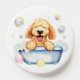 Cute dog watercolor illustration of a happy fluffy curly brown Goldendoodle dog in a bathtub. Great for dog lovers.