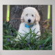 Adorable Goldendoodle Puppy holding a stick in her mouth.