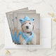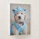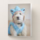 Goldendoodle puppy in light blue shark costume.