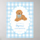 Welcome your guests in the sweetest way with this golden retriever first birthday welcome sign! Featuring an adorable golden doodle puppy with a blue gingham bow and matching checkered background, this personalized party poster adds the perfect touch of warmth and charm to your little one’s celebration.