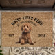 Goldendoodle Personalized Dog lover welcome doormat. This welcome mat can be personalized with your dog’s name, the slogan can also be changed or you could use a picture of your own dog (make sure it's transparent). Text reads: Daisy lives here…. All treats welcome