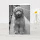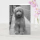 An adorable furry Goldendoodle puppy sitting on a backyard concrete walk along a brick wall in black and white.