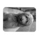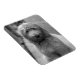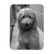An adorable furry Goldendoodle puppy sitting on a backyard concrete walk along a brick wall in black and white.