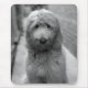 An adorable furry Goldendoodle puppy sitting on a backyard concrete walk along a brick wall in black and white.