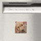 An adorable eleven week old Goldendoodle with bright eyes curiously peeks out from a doorway in a brick wall