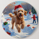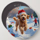 Goldendoodle Running in Snow with Christmas Hat Button