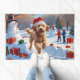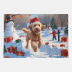 A fluffy Goldendoodle runs playfully through the snowy winter scene, wearing a festive red Christmas hat. This lively design highlights the breed’s curly coat, affectionate nature, and cheerful personality while capturing the joyful spirit of the holiday season. A heartwarming winter moment filled with festive charm.